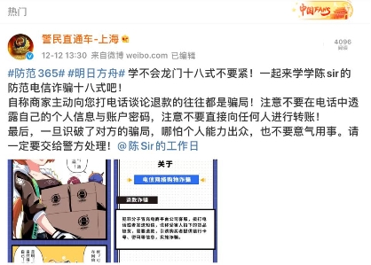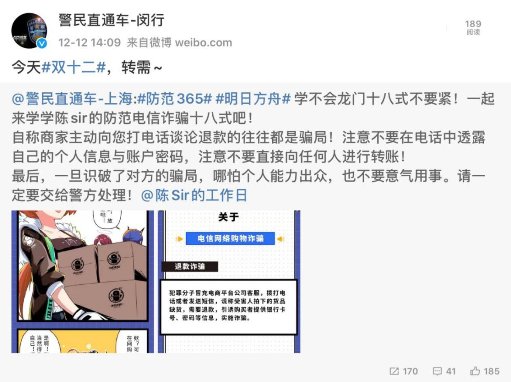 日,上海市公安局官方微博@警民直通車-上海與《明日方舟》人物陳Sir的微博@陳Sir的工作日聯(lián)合發(fā)布公益漫畫,旨在提醒廣大群眾和玩家防范電信網(wǎng)絡(luò)詐騙。