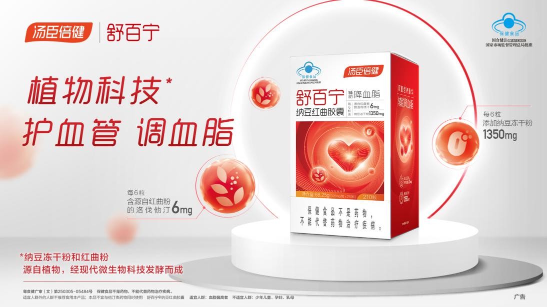 舒百寧納豆紅曲膠囊是湯臣倍健聯合了多所名校及科研機構,以心血管健康大數據為基礎,采用雙原料納豆與紅曲,具有輔助降血脂作用。