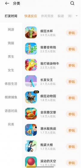 有別于其他休閑游戲平臺,歡太小游戲采用的是即點即玩的游戲形態(tài),無需用戶下載任何游戲,只需點開游戲即可快速開啟游戲時光。正是憑借這一特點,歡太小游戲收獲了大量粉絲用戶。此外,為了滿足每位用戶的游戲需求,歡太科技在歡太小游戲上匯聚海量休閑游戲資源,并貼心地對游戲資源進行精細化劃分。目前,歡太小游戲上已有網游、燒腦、體驗生活、棋牌捕魚、射擊等類別的游戲,細致的分類可以讓用戶快速定位到自己喜歡的游戲類型。