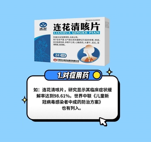 1、對癥用藥。《新冠病毒感染者居家中醫藥干預指引》中提到,癥見咽痛明顯、發熱、肌肉酸痛、乏力或咳嗽者,宜服用具有疏風清熱,化濕解表、清熱解毒功效的中成藥如連花清咳片等,此外,十余省市的新冠中醫藥診療方案及居家指引也推薦使用連花清咳片治療。研究顯示,其臨床癥狀緩解率達到98.61%。世界中聯《兒童新冠病毒感染者中成藥防治方案》也有列入。連花清咳片具有“快速止咳,清肺化痰”的作用特點,組方融匯東漢張仲景《麻杏石甘湯》宣肺泄熱,明代葉文齡《清金化痰湯》清熱化痰,可緩解氣道內炎癥、保護氣道黏膜、減少痰液生成,有效改善新冠所致的咳嗽咳痰癥狀。