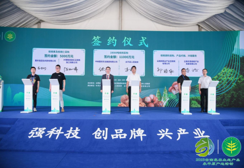 在開幕式現場舉行了“國家永平核桃產業示范園區”的揭牌儀式。中林國控實業集團有限公司、金達生物醫藥集團有限公司等34 家企業和單位簽署的涉及核桃、澳洲堅果、中藥材等森林生態產品總意向合作金額高達 22.27 億元。