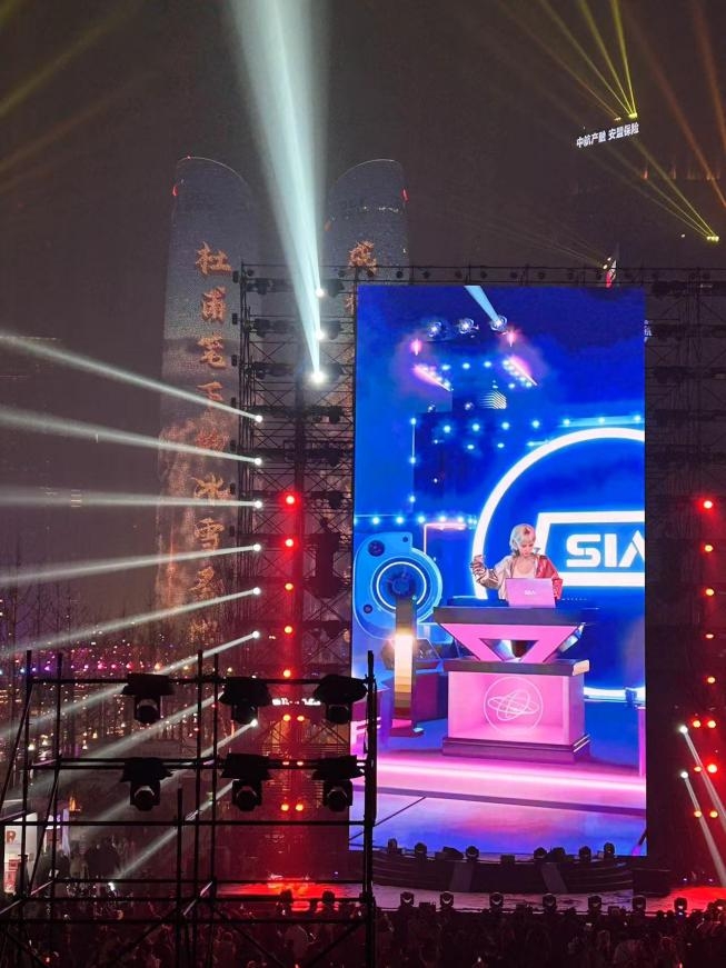 伴隨實時變換顏色角度的燈光,虛擬數字人“SIA”在成都交子大道的數字大屏幕中,擔當了現場DJ的角色,將自己獨特的風格融入到表演中,隨著電音調律的不斷變化,身體和視角跟隨搖擺,引導觀眾沉浸式感受現場熱烈的氛圍并參與其中。