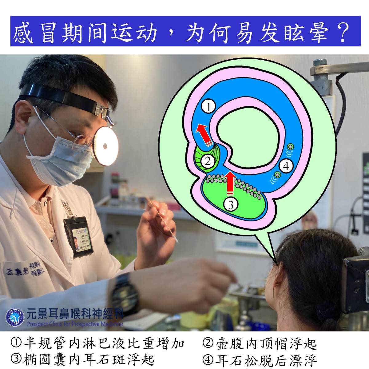 耳鳴權威、高雄元景耳鼻喉科神經科診所醫師陳建志稱,女子來到暈眩門診后,請她躺下就見到她眼球在快速地向下跳動,再請她坐起,又見到她眼球快速地向上跳動,持續數秒鐘,原來是罹患了兩側上半規管耳石沉積癥。女子稱,"我每次感冒,為了加速痊癒,都一定會去慢跑或跳有氧舞蹈",陳建志回答,"感冒時劇烈運動,確實容易引起眩暈,下次要注意喔!"
